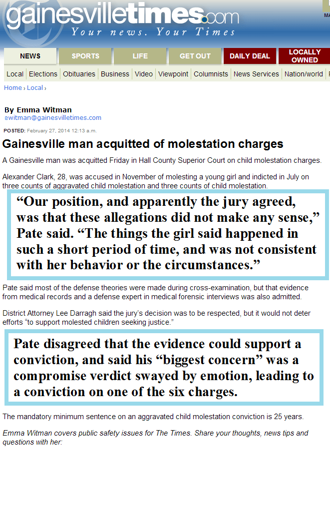 A Gainesville man was acquitted of multiple aggravated child molestation charges, thanks to legal representation by our firm.