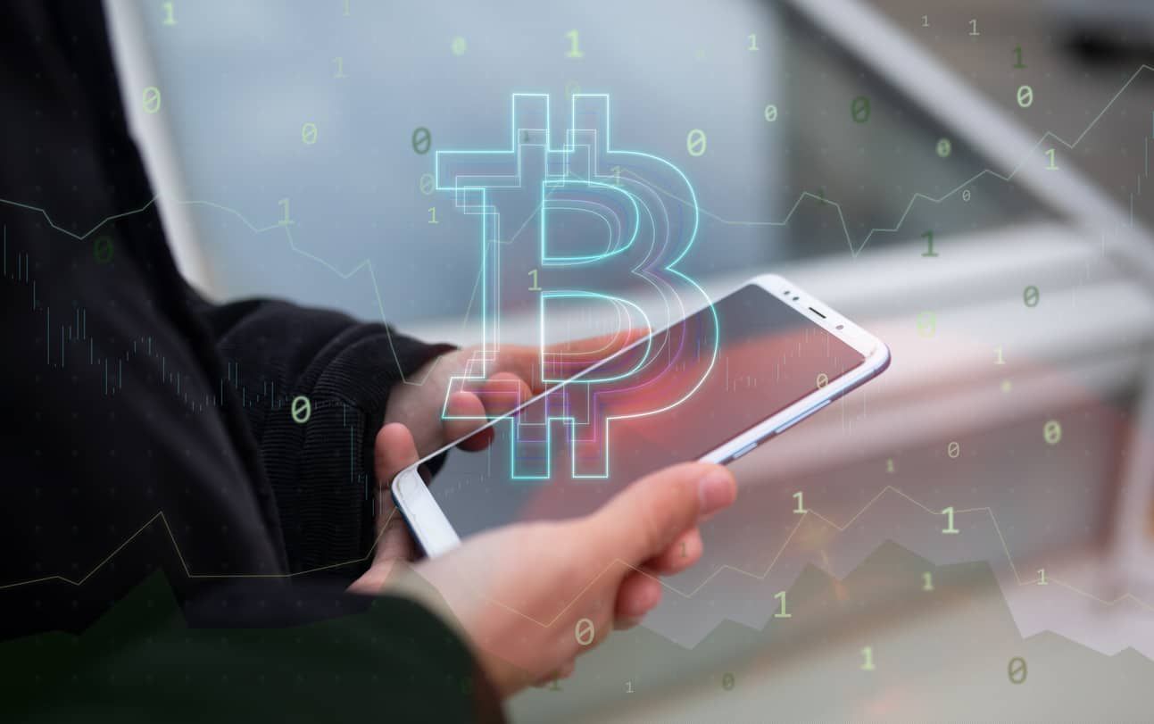 Unrecognizable person using his smart phone and trading Bitcoin. Bitcoin / Cryptocurrency concept.