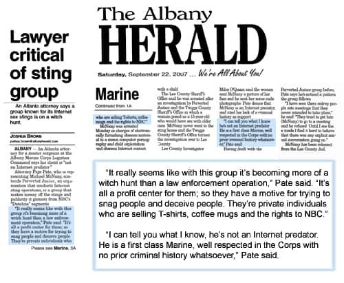 Criminal defense attorney Page Pate is retained to represent a U.S. Marine in internet sex sting prosecution and is critical of the sting group.