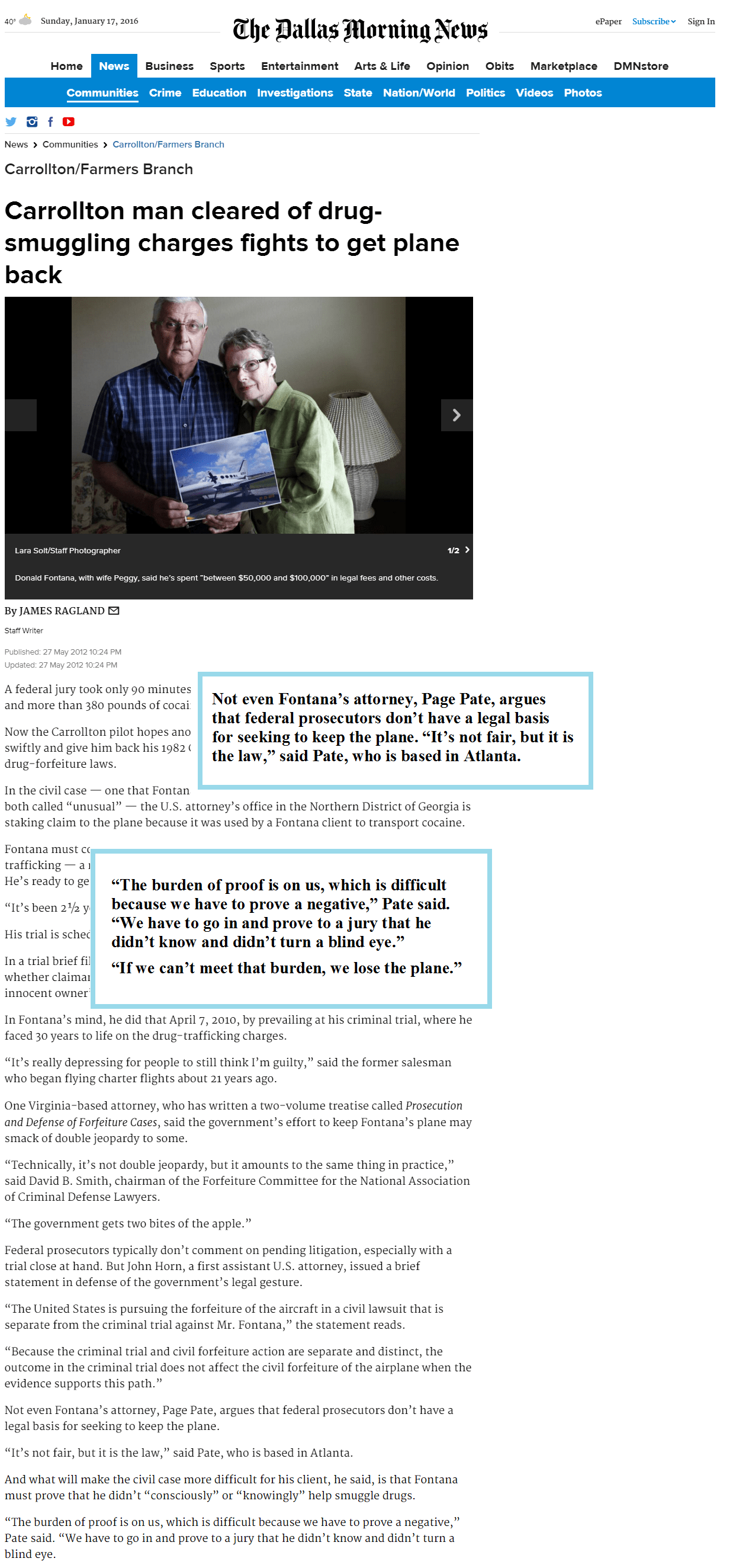 A Dallas-area man cleared of federal drug smuggling charges is now fighting drug-forfeiture laws to get his private plane returned.