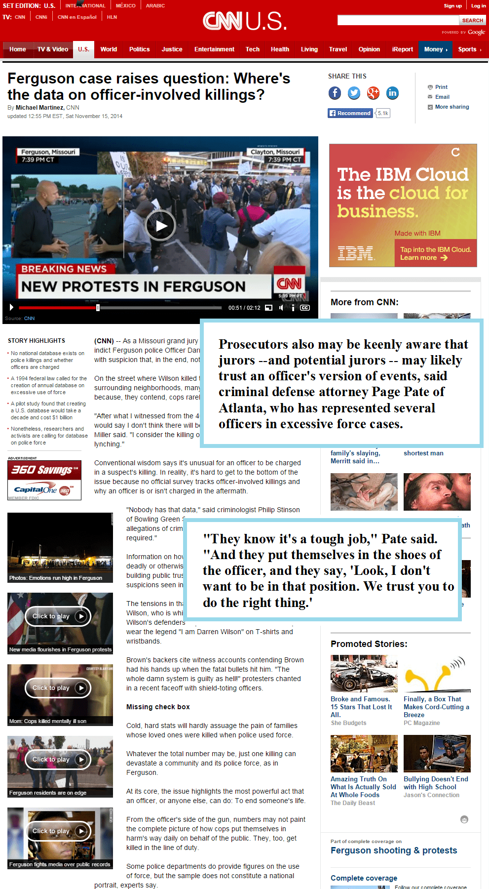 Criminal defense attorney Page Pate of Atlanta, Georgia, has represented several officers in excessive force cases and discusses the issue with CNN.com. Jurors and potential jurors are “likely to trust an officer’s version of events.”