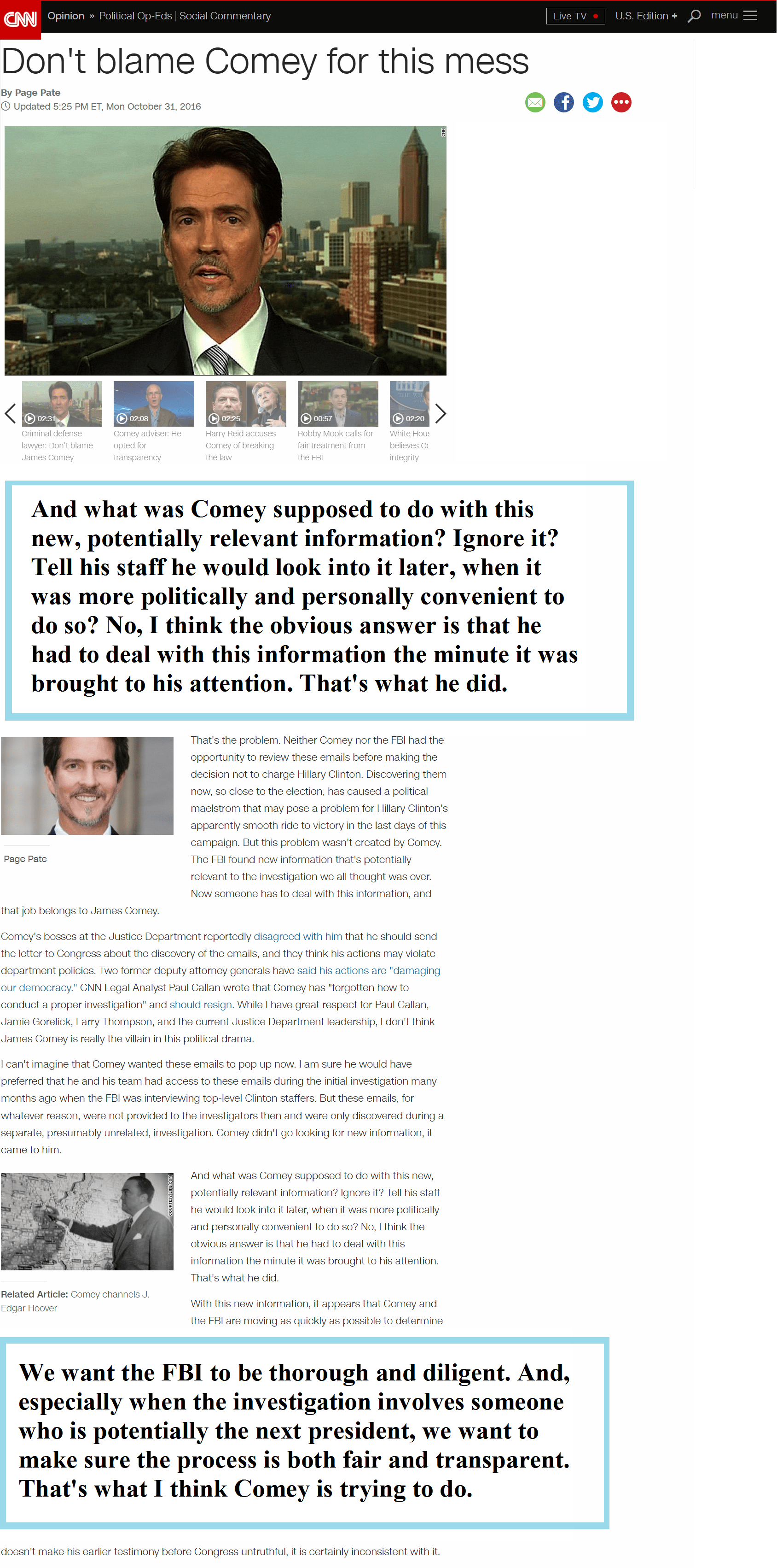 CNN publishes Page Pate’s commentary on FBI Director James Comey and the letter he sent to Congress relating to new information in the investigation of Hillary Clinton’s private email server.