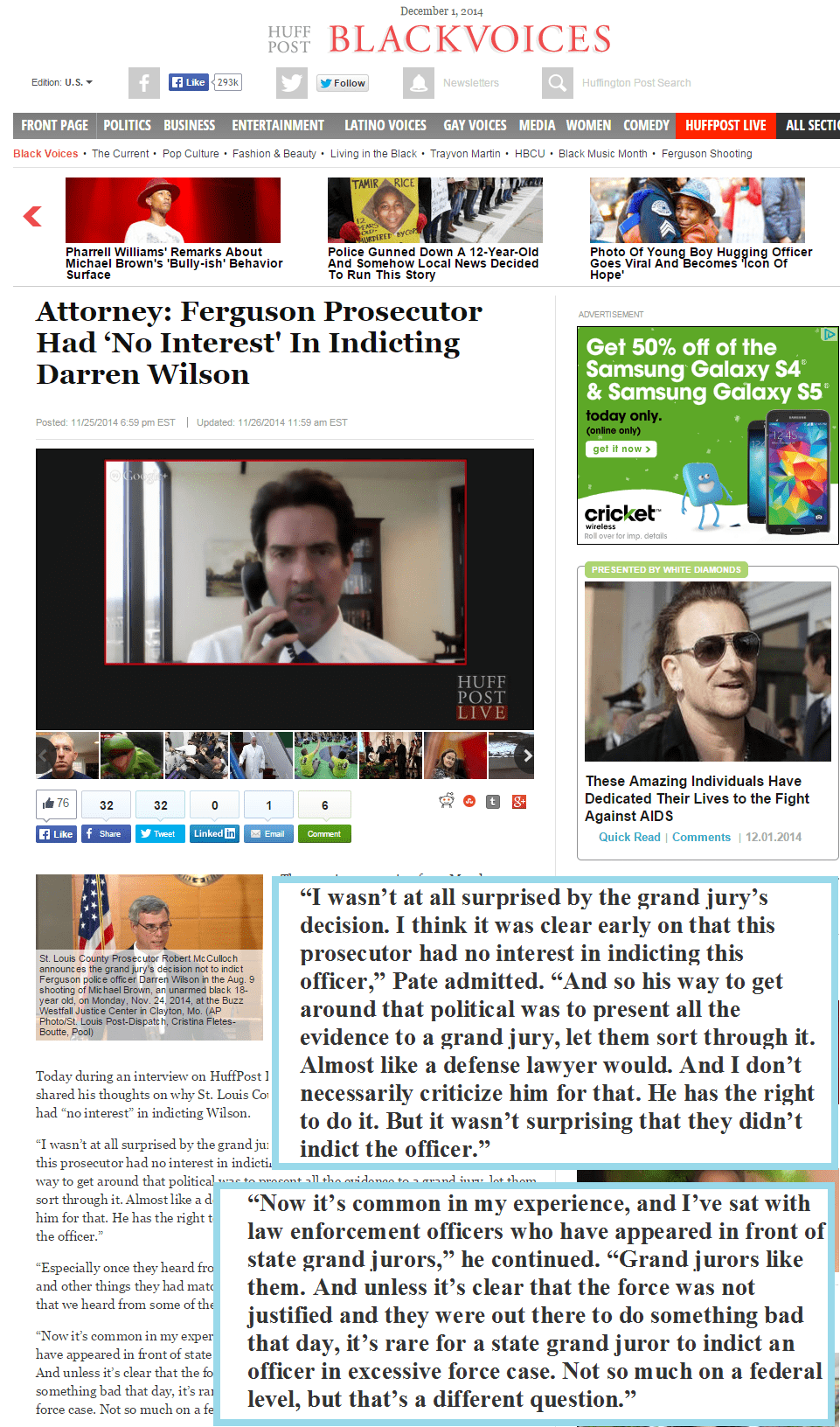 In a HuffPost Live segment, federal defense attorney Page Pate comments on the Ferguson grand jury decision for Huffington Post’s Black Voices section. Page stated that the prosecutor behaved “almost like a defense attorney would.”