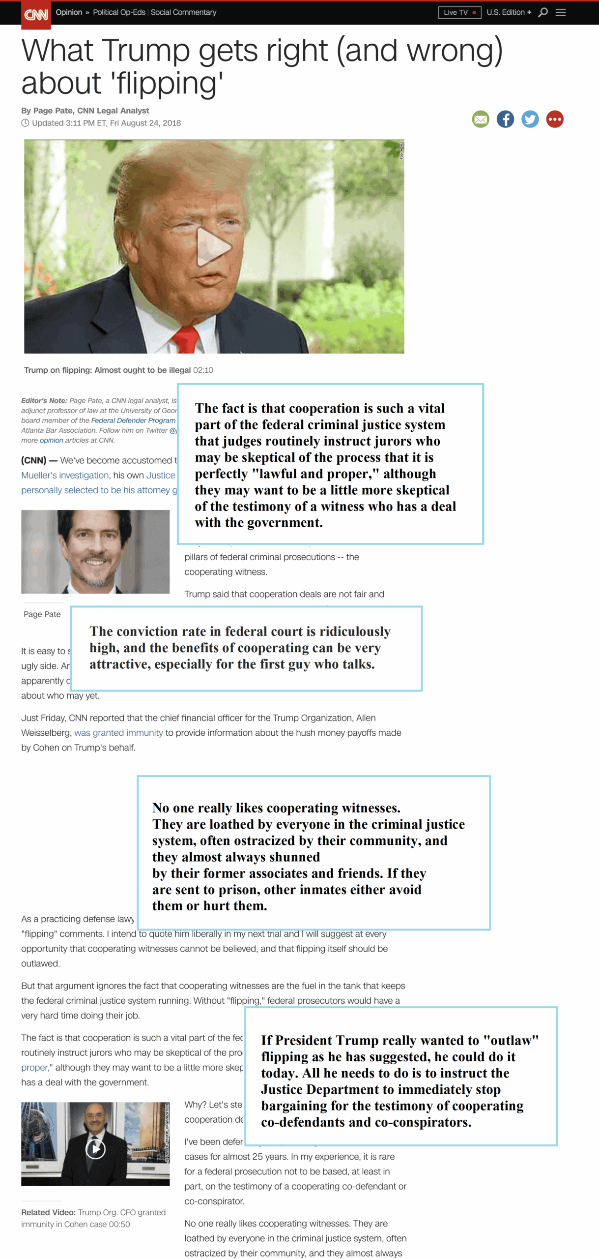 Regarding President Trump’s criticism of the act of cooperating, or “flipping,” Page says “If President Trump really wanted to “outlaw” flipping as he has suggested, he could do it today. All he needs to do is to instruct the Justice Department to immediately stop bargaining for the testimony of cooperating co-defendants and co-conspirators. Of course, if he does that, he needs to understand that the number of people convicted in federal court will dramatically plummet. And the number of acquitted defendants will almost certainly include a few guilty ones in the mix.”
